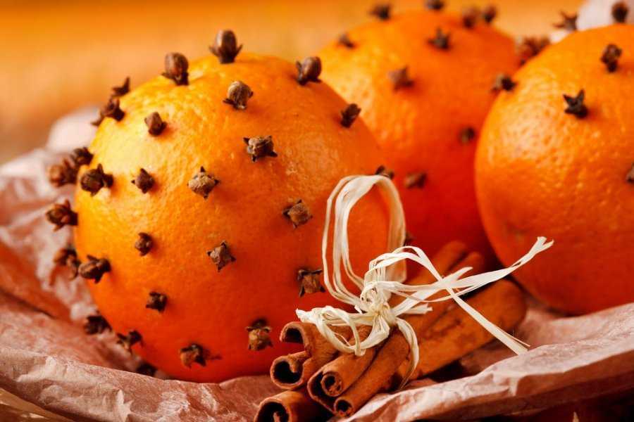 - Возьмите 15-20 соцветий сушеной гвоздики (можно больше или меньше, в зависимости от размера плода и ваших предпочтений) и воткните их в плод, чтобы он стал похожим на ежика.