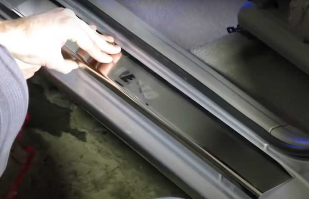 Теперь разбираем немного салон, а именно снимаем накладки порогов и пластик который идет изнутри салона (между передней и задней дверью).