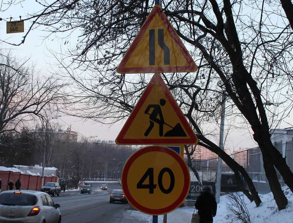 Чтобы разобраться, временный увиденный знак или нет, можно присмотреться к фону – для непостоянного ограничения заливку на картинке делают жёлтой, а после завершения реконструкции убирают. Но кроме знака «Сужение дороги», нередко в таких случаях также устанавливают дополнительный знак, сообщающий о проведении ремонта на путях: он обязывает владельцев автомобилей усилить сосредоточенность и снизить скорость авто при въезде на проблемный участок.