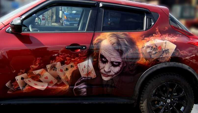 Отдельно стоит псевдо- или виниловая аэрография. Изображение находится на пленке, которой обтягивается автомобиль. Поверхность кузова тщательно моется, а затем обезжиривается. До ЛКП мастера не дотрагиваются. Если рисунок надоел, то пленка снимается самостоятельно путем постепенного нагрева феном.