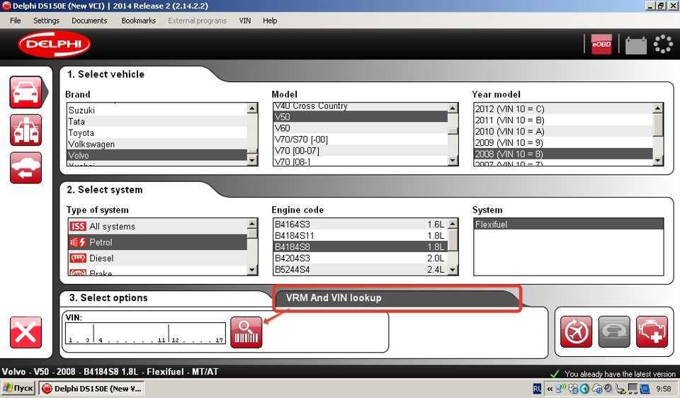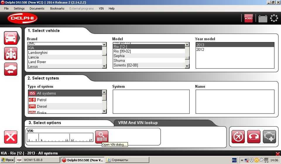В комплекте с девайсом идет одноименная программа Delphi DS150E (New VCI) 2014 Release 2 (несмотря на заставку, версия именно эта). Кроме нее, с этим сканером умеет работать Wurth WOW!, в моем случае это версия 5.00.8. Концептуально программы близки, а о нюансах каждой читайте в соответствующем разделе. Сам сканер пришел с прошивкой 1410, в него благополучно была залита 1423. Есть возможность залить версию 1430, что будет сделано несколько позже. Ну и отдельно есть версия протокола eOBD, ее не помню — сто-какая-то.