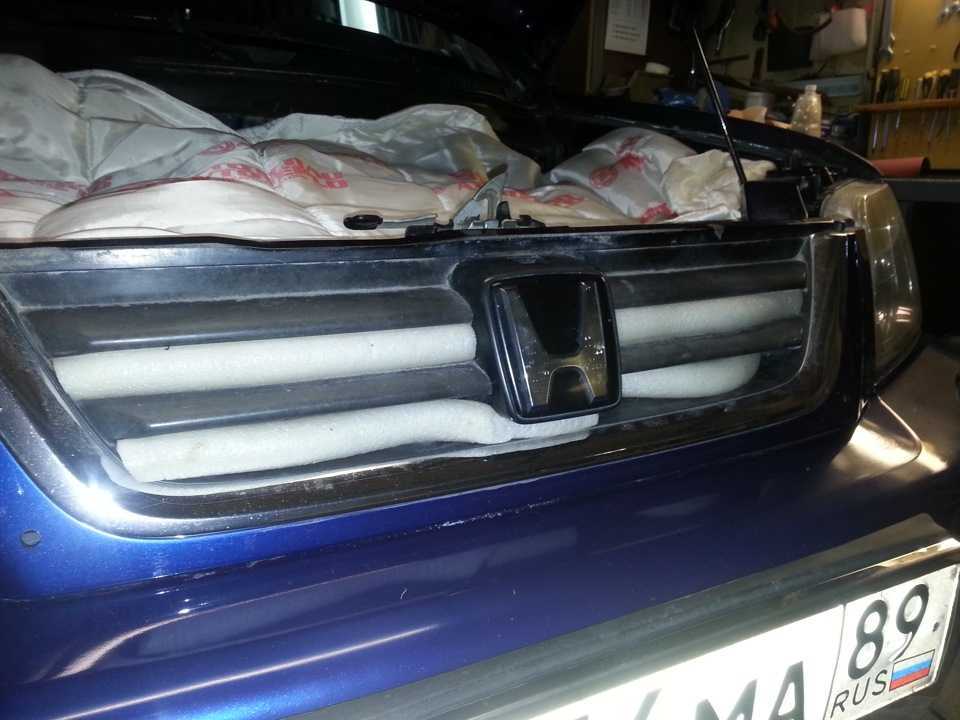 Более эффективное мероприятие – закрыть фольгированным изолоном радиаторную решетку с внутренней стороны или дермантином снаружи: отсутствие обдува холодным воздухом деталей силовой установки способствует ускорению прогрева на ходу. Заводские комплекты накладок и масок не менее эффективны, но дорого обходятся и не всегда соблюдают эстетическую картину.