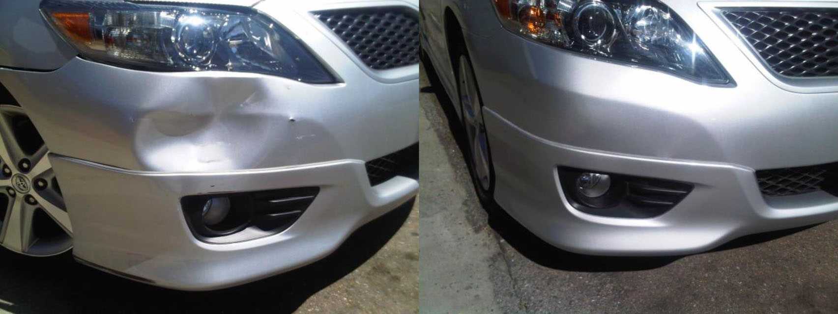 С другой стороны, если деформации небольшие, без вытягивания металла и разрывов, да ещё и там, где нет рёбер жёсткости, то их можно исправить, не прибегая к последующей покраске. Это достигается восстановлением исходной формы механическим путём с сохранением лакокрасочного слоя, но это сложная и длительная работа.