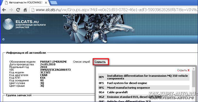 Как видите, появилась небольшая расшифровка комплектации по ВИН номеру, но это еще не все. Справа есть ссылка «Показать список опций», нажимаем на нее.