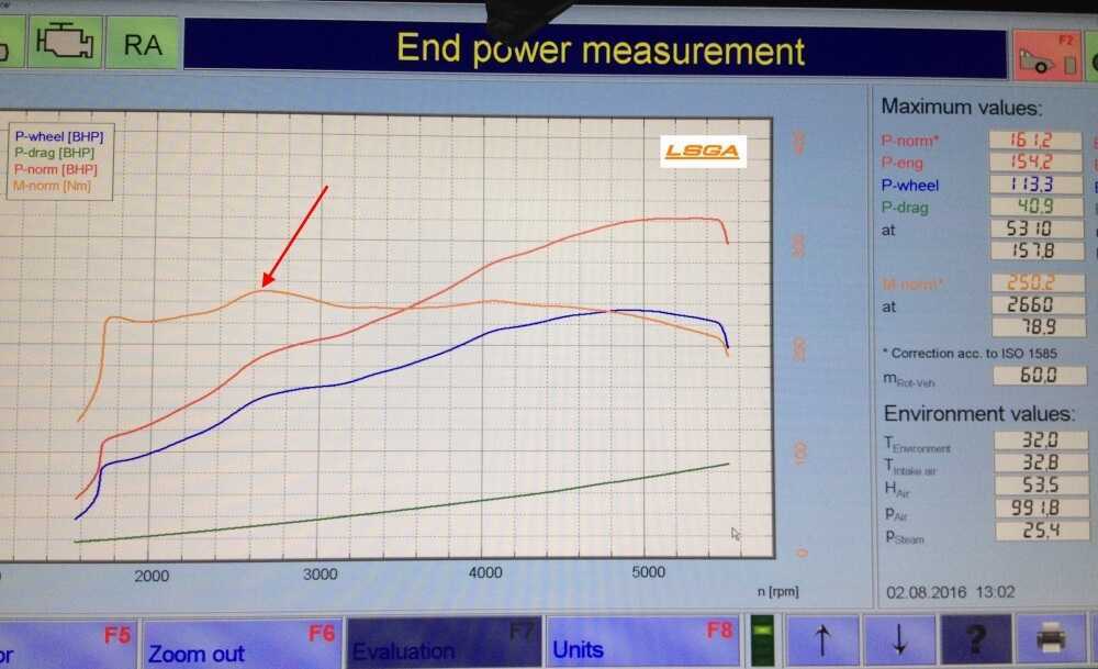 Красной стрелкой указана кривая момента. Видно, что с 2600 об/мин крутящий момент начинает падать — необходимо дорабатывать «впуск» и «выпуск» автомобиля.