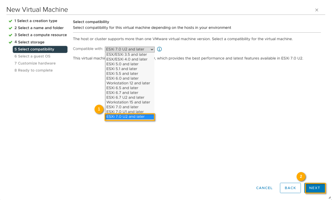 На этапе 5 Select compatibility указать совместимостьВМ с платформой виртуализации и нажать Next. Чтобы получить доступ к новейшим аппаратным функциям, нужно выбрать последнююверсию ESXi.