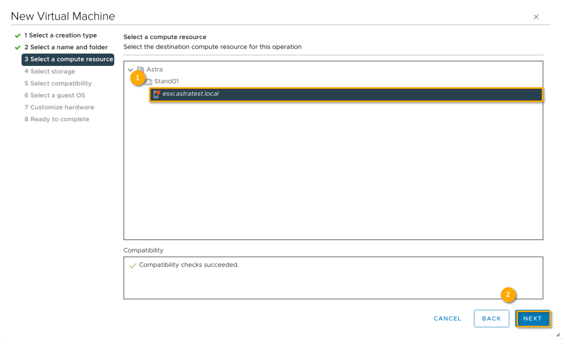 Наэтапе 3 Select a compute resourceвыбрать вычислительный ресурс (хост, кластер, пул ресурсов или vApp), на котором будет работать ВМ, и нажать Next.Если создание ВМ в выбранном месте вызывает проблемы совместимости, на панелиCompatibilityпоявляется предупреждение.