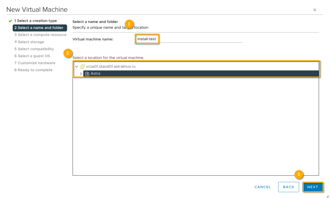 На этапе 2 Select a name and folder ввести уникальное имя ВМ и указать место развертывания, нажать Next. латинского алфавита и допускает ввод любых символов, цифр, знаков и пробела.