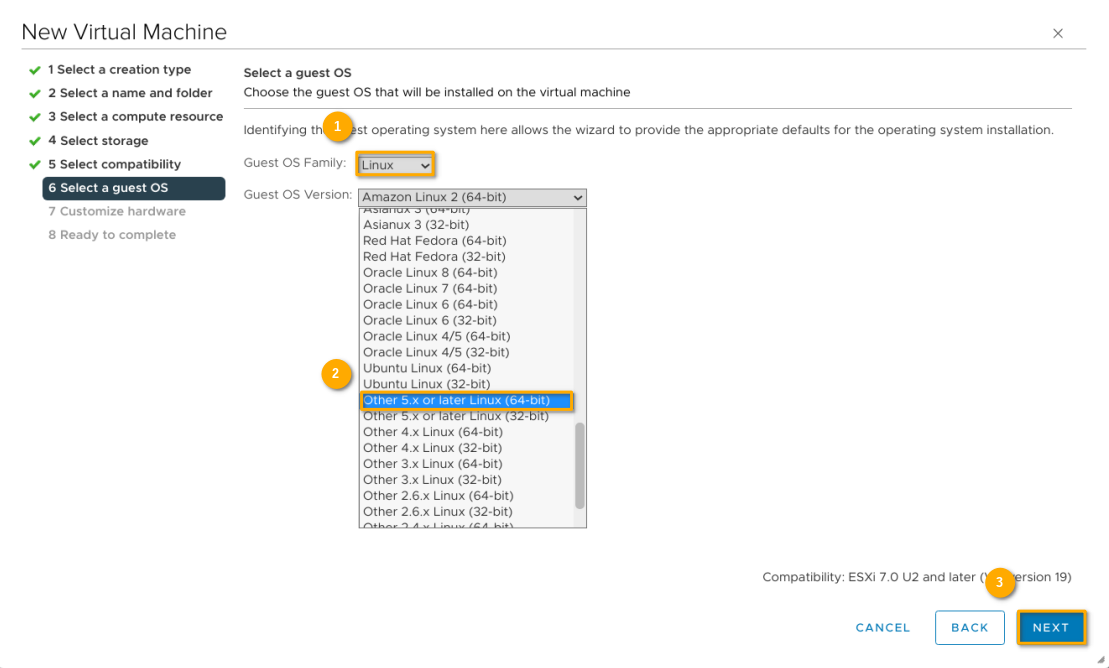 - версию гостевой ОС (Guest OS Version) – Other 4.x or later Linux (64-bit) или Other 5.x or later Linux (64-bit).