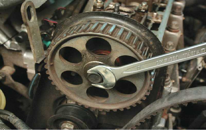 Установите ремень привода газораспределительного механизма или цепь обратно в надлежащее положение, аккуратно вращая распределительный вал и коленчатый вал.