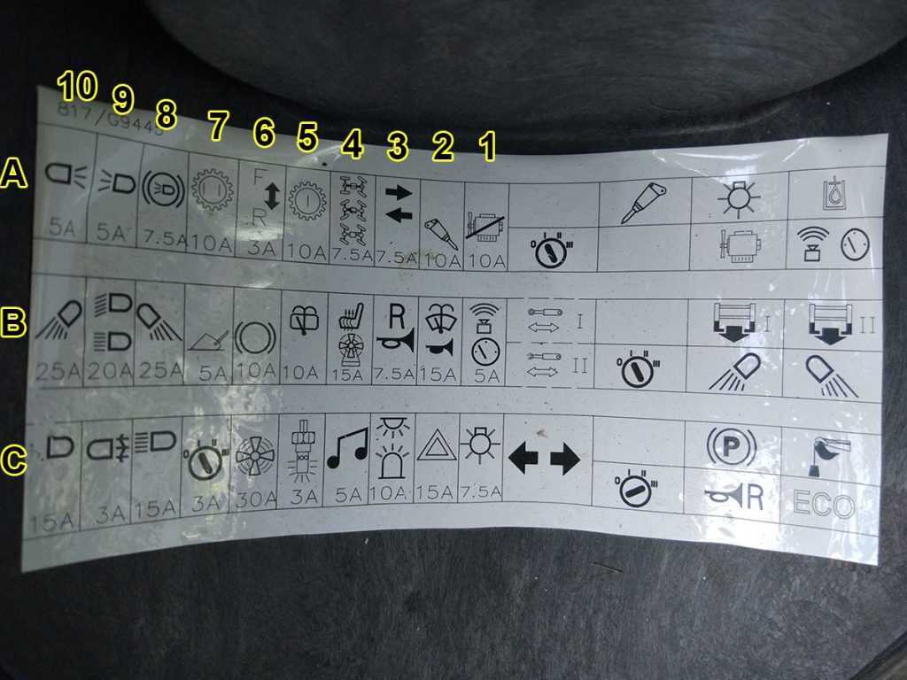 Колонка “A”1 – Электроника, соленоид топливного насоса (останов двигателя) 10А 2- Дополнительная (вспомогательная) гидравлика, гидро молот 10А3 – сигналы поворотов 7,5А4 — Рулевое управление колесами, крабовый ход 2WS, 4WS 7,5А5 – Управление коробкой передач, трансмиссия6 – Электрическое заднее стекло 7 – 8 – Сигналы торможения9 – габаритные огни10 – габаритные огни