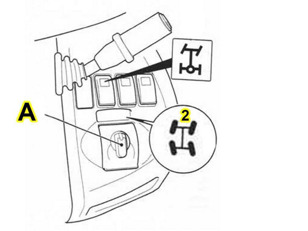 В режиме “след в след” поворачиваются все четыре колеса в противоположенную сторону, что обеспечивает лучшую маневренность в узких местах. Для переключения в режим управления “след в след”, поверните трех позиционный переключатель “A” влево положение (2).