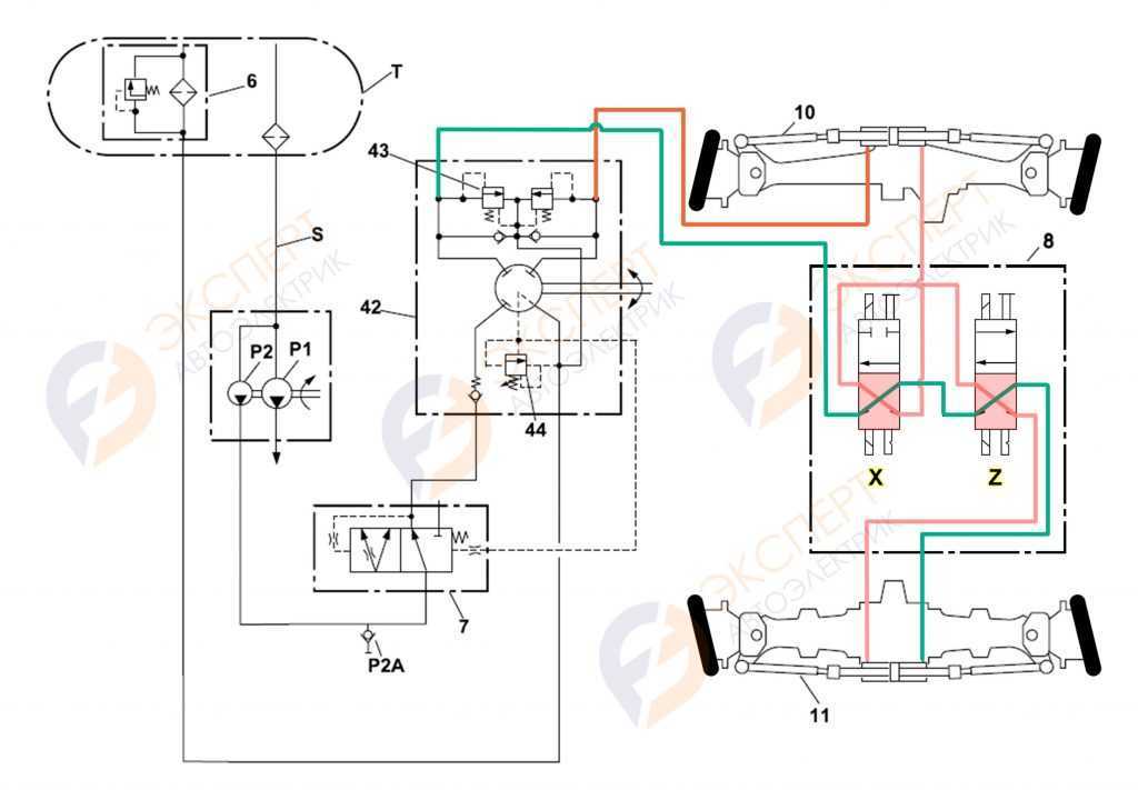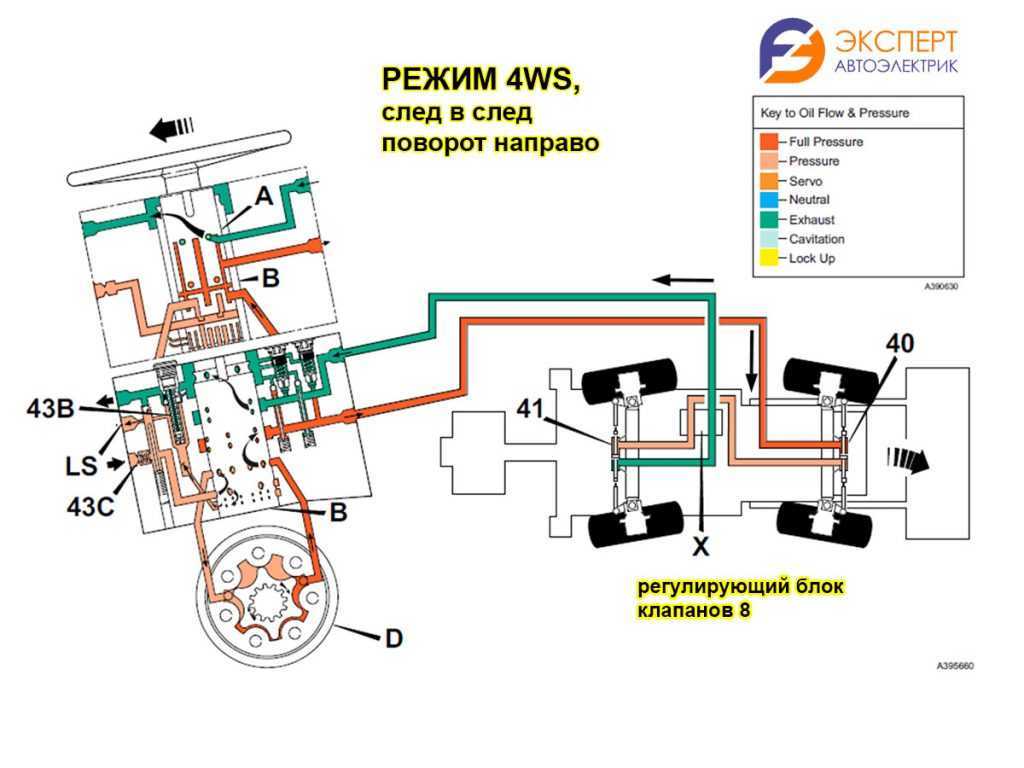 Рассмотрим более подробную гидравлическую схему JCB в режиме 4WS.