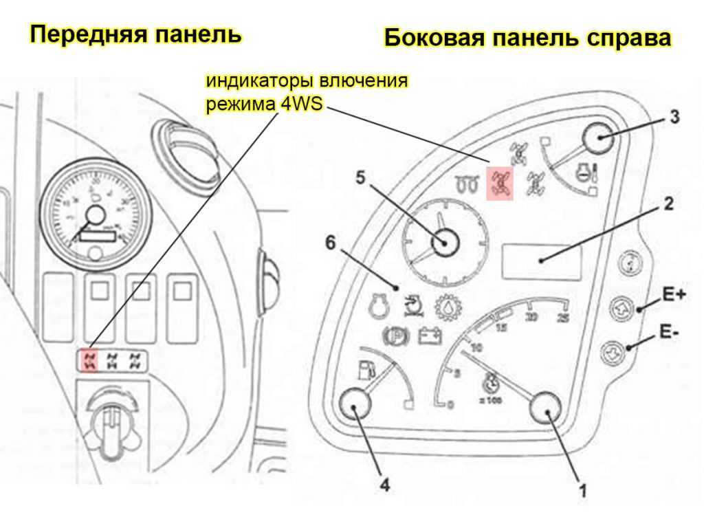 При выборе режима 4WS загораются соответствующие индикаторы 13 на передней и правой боковой панели.