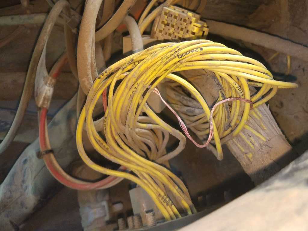 Пример 2. Замыкание силового провода на массу (корпус) экскаватора JCB 3CX, в следствии чего произошло оплавление изоляции и провод склеился в общем жгуте. Здесь пришлось полностью вскрывать весь жгут и восстанавливать электропроводку, потому что соседние провода тоже оплавились и пострадали.