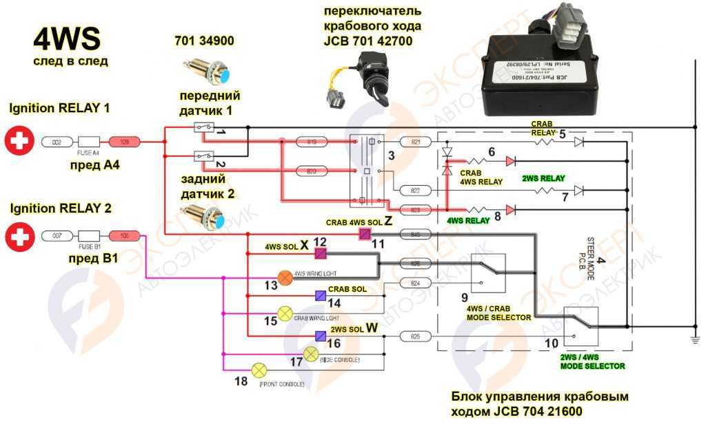 Электрическая схема, 4WS режим включен (2ой режим влево) схема JCB