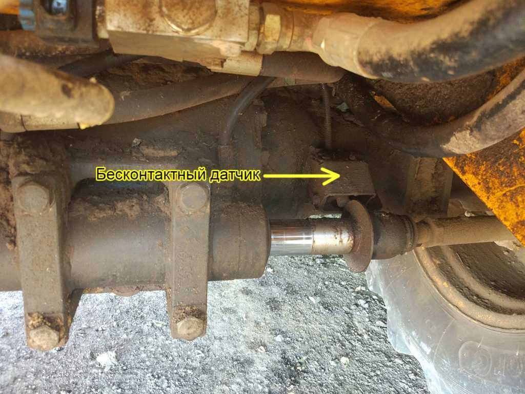 Бесконтактные переключатели (датчики) на передней оси “D”(701/80312) и задней оси “E” (701/80312) сигнализируют, когда колеса находятся в положении прямолинейного движения (на датчике горит светодиод).Находятся эти датчики на гидроцилиндре спереди и сзади.