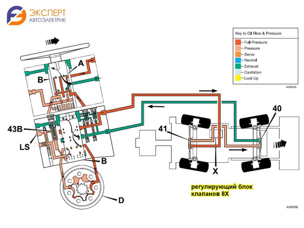 Поворот налево (след в след) 4WS. При повороте рулевого колеса налево, внутренний золотник A поворачивается на несколько градусов относительно внешнего золотника B и посылает сигнал давления на предохранительный клапан 43B и через порт LS на приоритетный клапан.