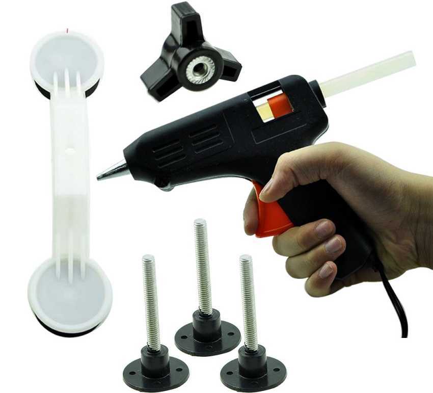 В него входит специальное пластиковое коромысло. Оно имеет широкие ножки с мягкой полимерной губкой на концах, для предотвращения повреждения поверхности. Несколько насадок различной площади, именно их подошвы приклеиваются к дефекту и производят выпрямление вмятин. Термопистолет и несколько стержней с силиконовым термоклеем.