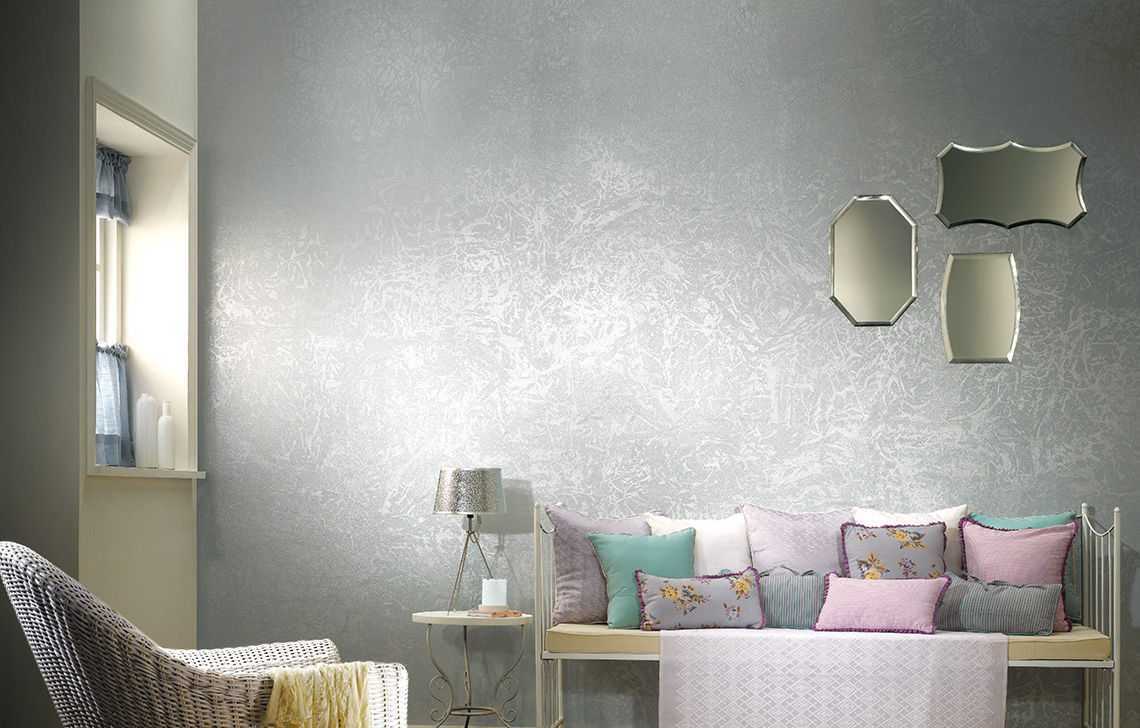 Для покрытия можно использовать перламутровую краску или перламутровую штукатурку. Последняя не требует идеальных стен, с ее помощью легко скрыть недочеты. Способ нанесения, как с обычными красками.