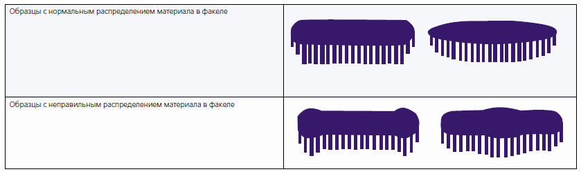 Для качественной и эффективной покраски материал должен распределяться равномерно или с незначительной концентрацией в центре факела. Образцы правильного и неправильного распределения материала приведены ниже.