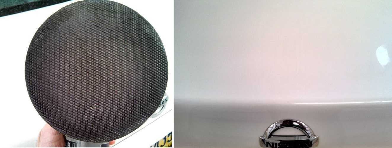 Для очистки использовался круг medium grade Nanoskin Autoscrub на орбитальной полировальной машинке с большим количеством смазывающего состава (разбавленный Nanoskin Glide). Это поролоновый круг в сочетании с очень мягкой резиновой поверхностью. После снятия загрязнений и протирания микрофиброй поверхность была отполирована.
