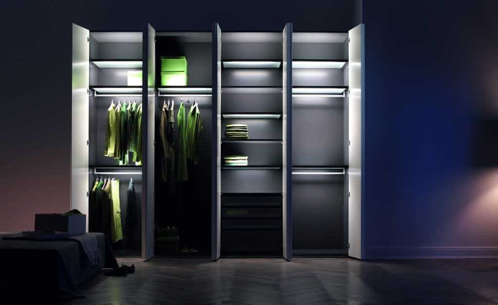 Тот, кто на первое место ставит эстетическую составляющую, в качестве основания для светодиодной ленты должен использовать алюминиевый профиль с рассеивателем. Он одновременно выполняет полезную и декоративную функцию: препятствует быстрой деградации кристаллов и гармонично сливается с конструкцией шкафа. Микровыключатель (концевик) необходим для включения/отключения света при открывании дверей. В шкафу-купе удобно установить два концевика симметрично с обеих сторон, чтобы разделить подсветку на две части. Каждый из них должен выдерживать максимальный ток нагрузки. Для шкафа длиной до 3 метров, потребление мощной светодиодной ленты не превысит 5А, 12В.