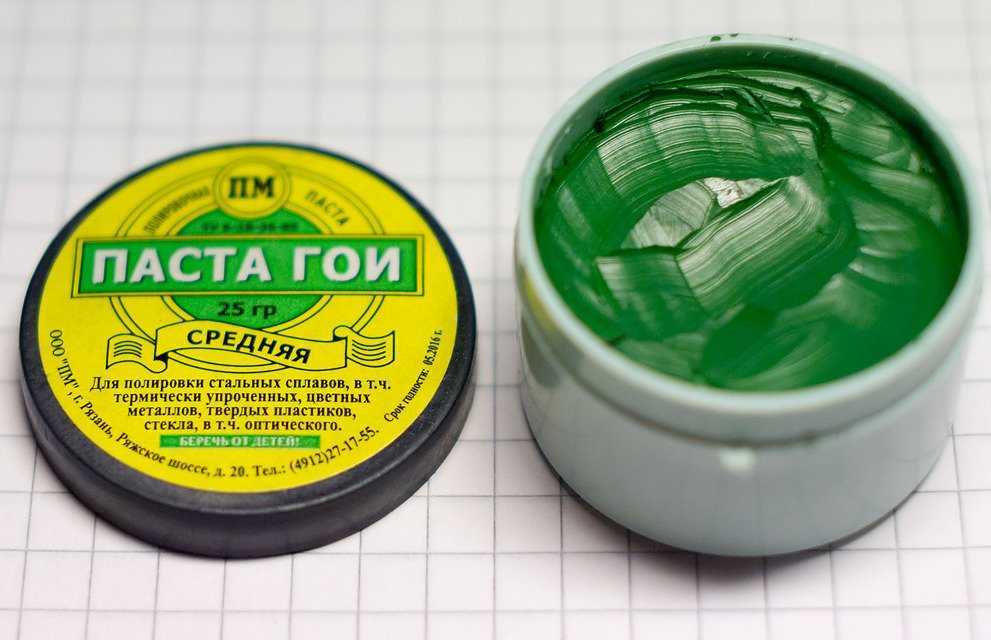 Паста ГОИ в своём составе имеет оксид хрома и является универсальным полировально-шлифовальным средством. С её помощью можно полировать металл, пластик и стекло. С ней хорошо знакомы мужчины, которые служили в армии. Там она используется для натирания блях и пуговиц.