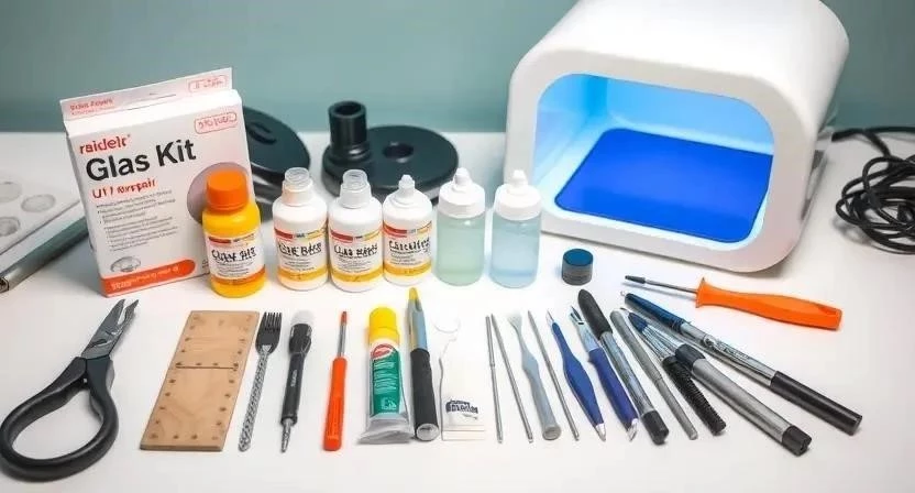 Необходимые материалы и инструменты: специальная смола для ремонта сколов, ультрафиолетовая лампа, инжектор, лезвие, очиститель стекла, полировальная паста.