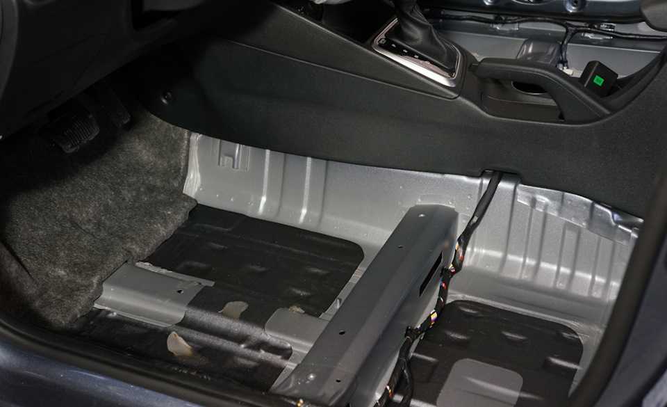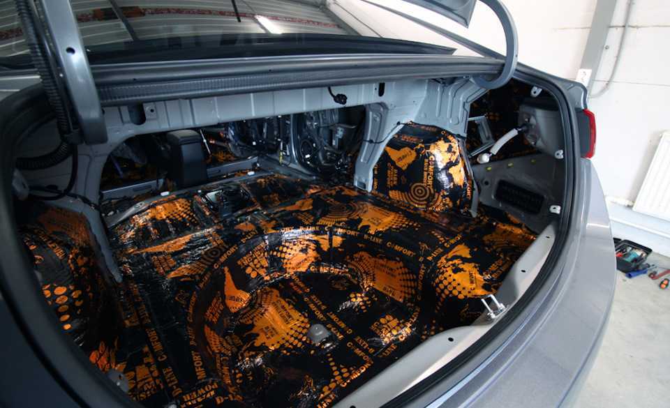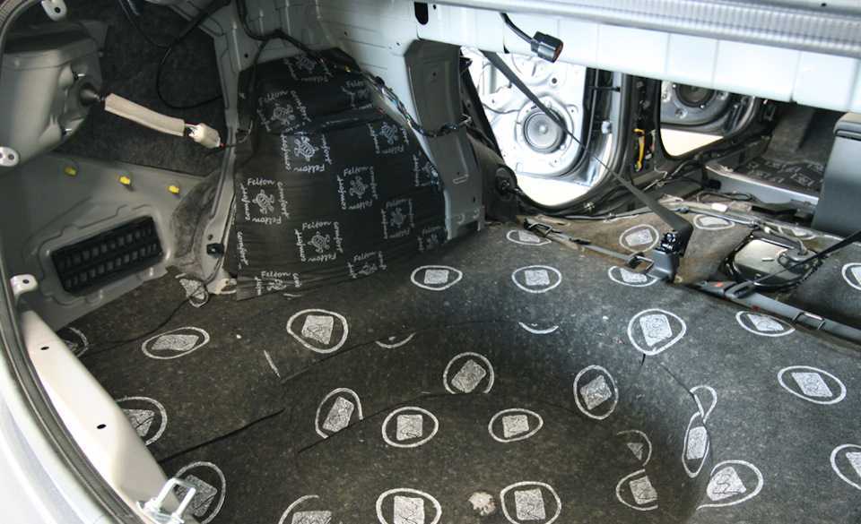 Днище, колесные арки и багажник. Сначала снимается заводская шумоизоляция, все поверхности обезжириваются. После укладки виброизоляции наклеивается шумоизоляция. Это гарантирует качественную защиту от шума.