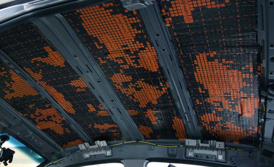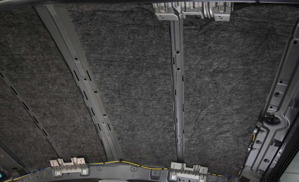 Потолок. Вначале удаляется заводская виброизоляция, поверхность обезжиривается и наносится вибропоглощающий материал. Вторым слоем наносится шумотеплоизолирующий материал. Все коробчатые элементы остаются открытыми.