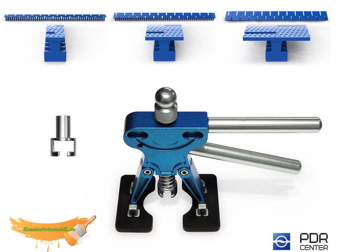 Приспособления для вытягивания вмятин, как правило, приобретаются одним набором, содержащим до 40 видов различных инструментов. Удаление повреждения крюками без необходимости покраски осуществляется в такой последовательности: