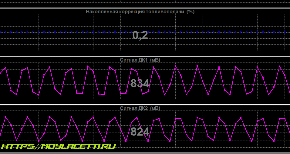 Сигнал первого датчика кислорода — в идеале должен иметь пилообразную форму на холостом ходу. При помощи него можно многое узнать о подаче топлива и о запорных свойствах форсунок. Более подробно о нем на странице Лямбда зонд