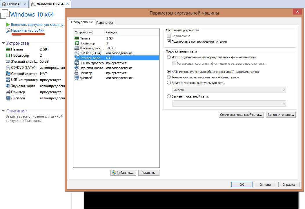 Для этого заходим в параметры виртуальной машины и выбираете новый или существующий сетевой адаптер. По умолчанию стоит NAT, в данной настройке встроенный сервер DHCP, выдает вам внутренний ip адрес. Так же при установке VMware, у вас на физическом хосте создается два сетевых виртуальных интерфейса, через которые и проксируется трафик.