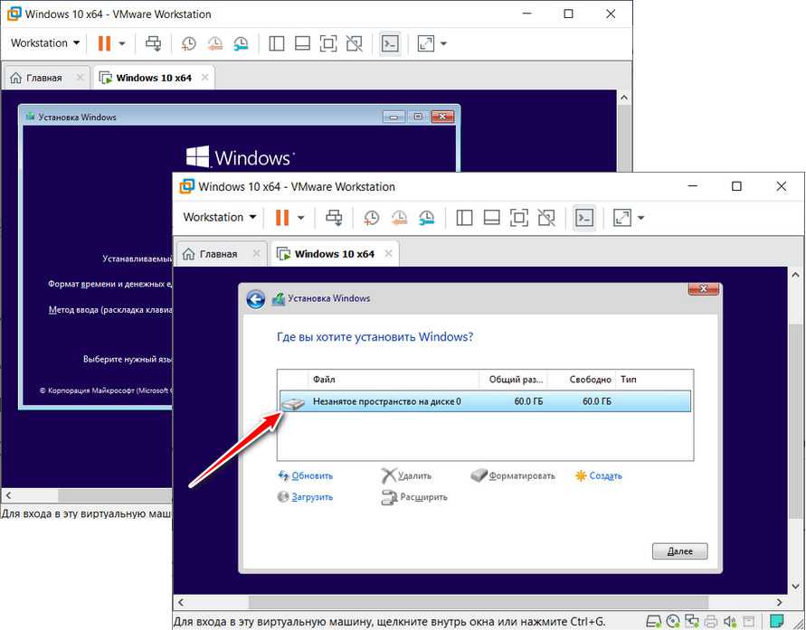Даже если используется функция быстрой установки Windows, всё равно необходимо отслеживать этот процесс. Не все его этапы могут быть автоматизированы, возможно, где-то потребуется наш, пользовательский выбор. Это зависит от дистрибутива ОС. Если функция быстрой установки недоступна, нам просто необходимо в окне VMware Workstation пройти обычный процесс установки Windows, как мы это делаем на физическом компьютере. Но с той лишь разницей, что местом установки ОС нужно указать незанятое пространство на диске – т.е. всё место на новом виртуальном диске ВМ. Загрузочный и системный разделы будут созданы автоматически в процессе установки Windows.