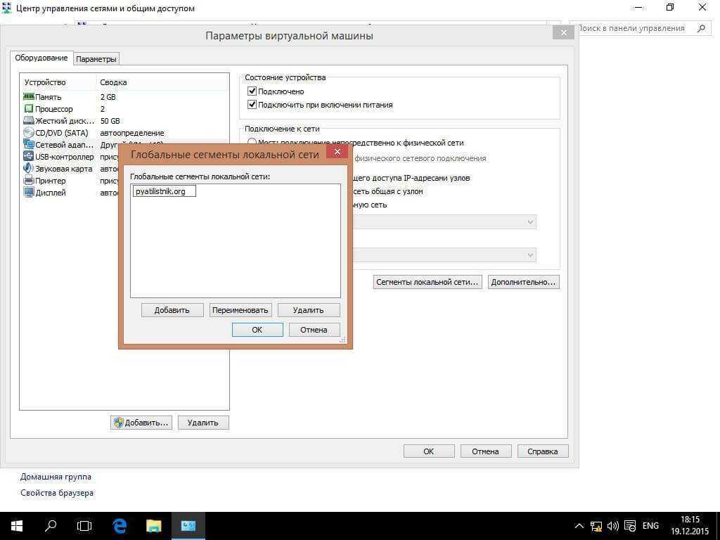 Изолированная сеть, трафик между виртуальными машинами бегает внутри виртуального коммутатора и никуда более. Создается очень просто в настройках виртуалки. Жмем Сегменты локальной сети > Добавить. Задаем имя у меня пусть это будет как название сайта pyatilistnik.org.