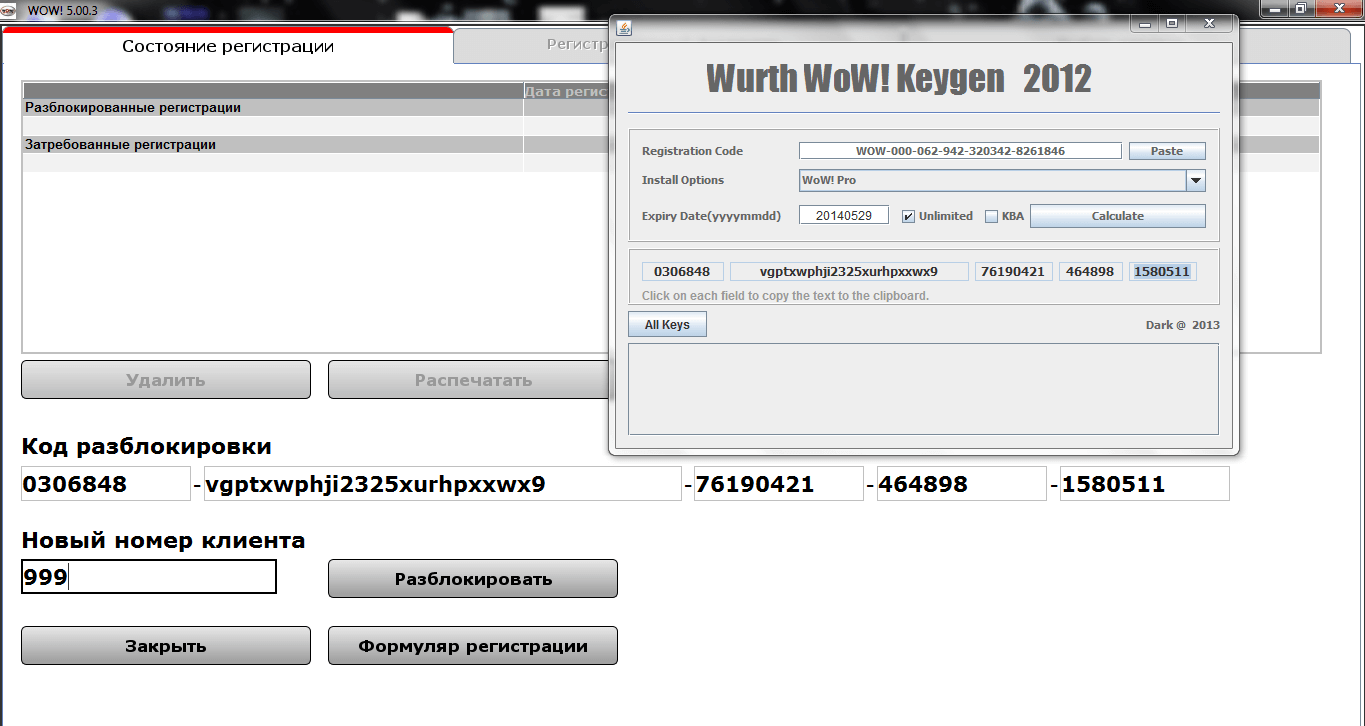 26. Вставляем в поле «Код разблокировки» сгенерированный ключ. В поле «Новый номер клиента» прописываем «999». Нажимаем «Разблокировать».