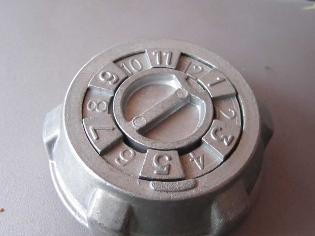 Существуют также крышки кодовые. Принцип действия в них аналогичен крышкам с ключом. Одна часть подвижная с цифрами, вторая — неподвижная. Владелец автомобиля, знающий код, фиксирует подвижную часть крышки в одном положении, например, как на фото — 5 и 11, и открывает её.