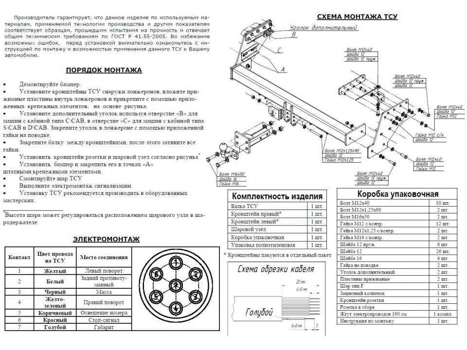 Для установки фаркопа используются винты из комплекта поставки. Крюк нижнего крепления (тип F, съемный, кованный шар с 2мя отверстиями) с шаром европейского стандарта диаметром 50 мм. присоединяется к раме с помошью надежных винтов. Крюки также цинкуются и окрашиваются порошковой краской. Комплект универсальной электропроводки позволяет подключить розетку тягово-сцепного устройства (ТСУ) к задним фонарям автомобиля.