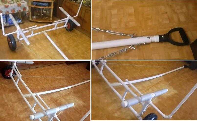Из пластиковых труб можно сделать более функциональную тележку для перемещения надувной лодки. У данной конструкции имеются продольные ложементы, на которые опирается корпус плавсредства, маячки для ориентации при погрузке в воде, ручка для перемещения. Также предусмотрена регулировка длины ручки и ширины установки маячков, что обеспечивает возможность перемещения лодок разных размеров.