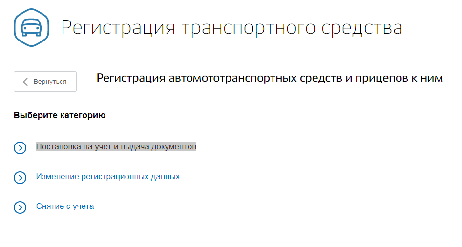 Первый этап: найдите услугу по регистрации транспортного средства.