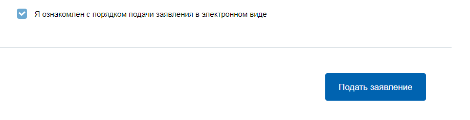Затем нужно поставить галочку возле пункта “Я ознакомлен с порядком подачи заявления в электронном виде” и нажать «Подать заявление».