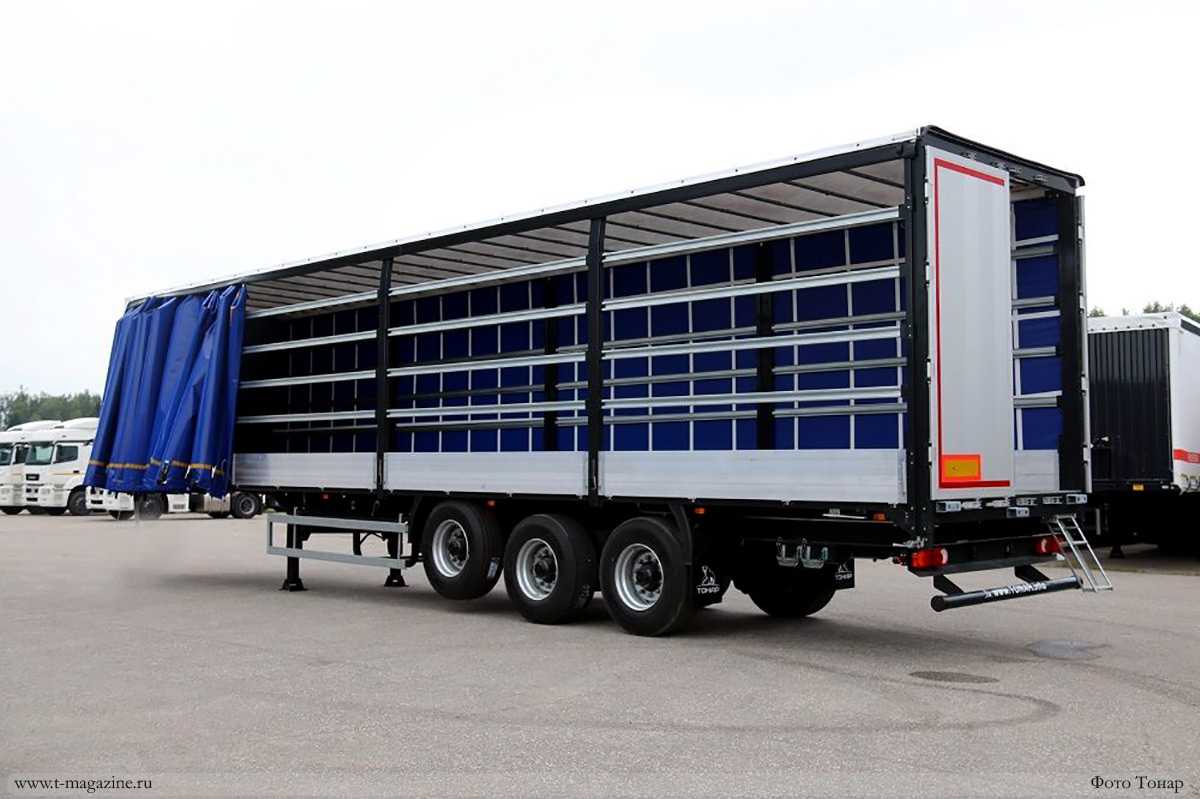 Такая система позволяет максимально натягивать тент. Он может выдержать вес груза, опрокинутого изнутри прицепа. Боковые тенты подвешены на ролики и могут сдвигаться на них в стороны.