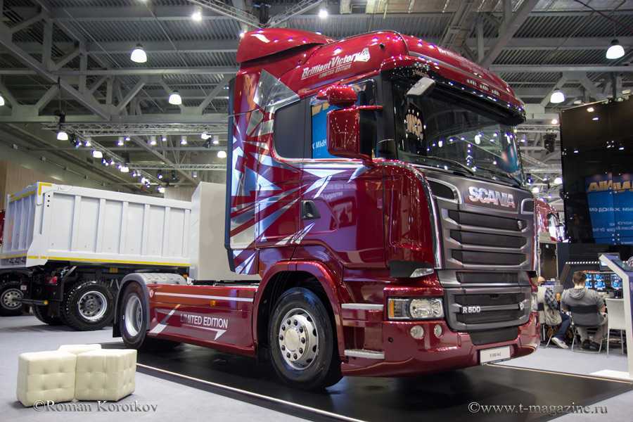 Ещё одной «изюминкой» экспозиции стал грузовик лимитированной серии «Brilliant Victory». Седельный тягач Scania R 500 LA4X2HNA оснащён двигателем стандарта ЕВРО 5 мощностью 500 л.с. Автомобиль выполнен в цвете «Ruby Red» с эксклюзивным дизайном, что, символизирует свою яркую индивидуальность в сочетании с надежностью и высокой производительностью.