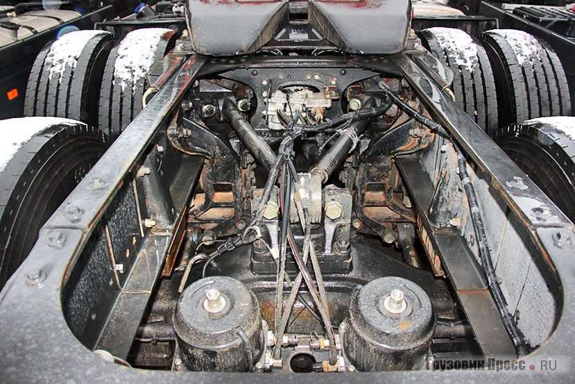 При подъёме кабины открылось ещё несколько особенностей автомобиля, подчёркивая тот факт, что эта техника адресована строительной отрасли. Впускная магистраль имеет два последовательных воздушных фильтра со сменными элементами – хорошая подмога для работы на грунтовых дорогах и в условиях сильной запылённости. Масло в двигателе фильтруется в три этапа: центрифугой и двумя сменными полнопоточными элементами тонкой очистки. Вот так забота о внутренней чистоте мотора! Система питания рядной «шестёрки» – Common Rail также оснащена двумя фильтрами тонкой очистки топлива, расположенными непосредственно под рейкой высокого давления. Ещё есть фильтр в системе охлаждения с ингибитором коррозии!