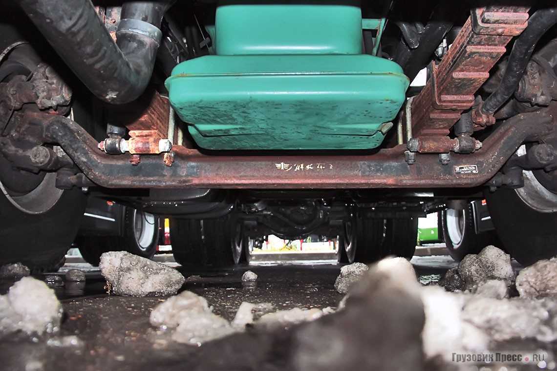 Как и трансмиссионные решения, многое на строительный тягач перекочевало от самосвального шасси. Рама двойная во всю длину типа «лонжерон в лонжероне», высота профиля 320 мм, полок 90 мм, толщина каждого из лонжеронов по 8 мм, есть и дополнительные усилители. Подвеска вполне стандартная: впереди пакет из девяти листов, сзади на балансире 11 листов.