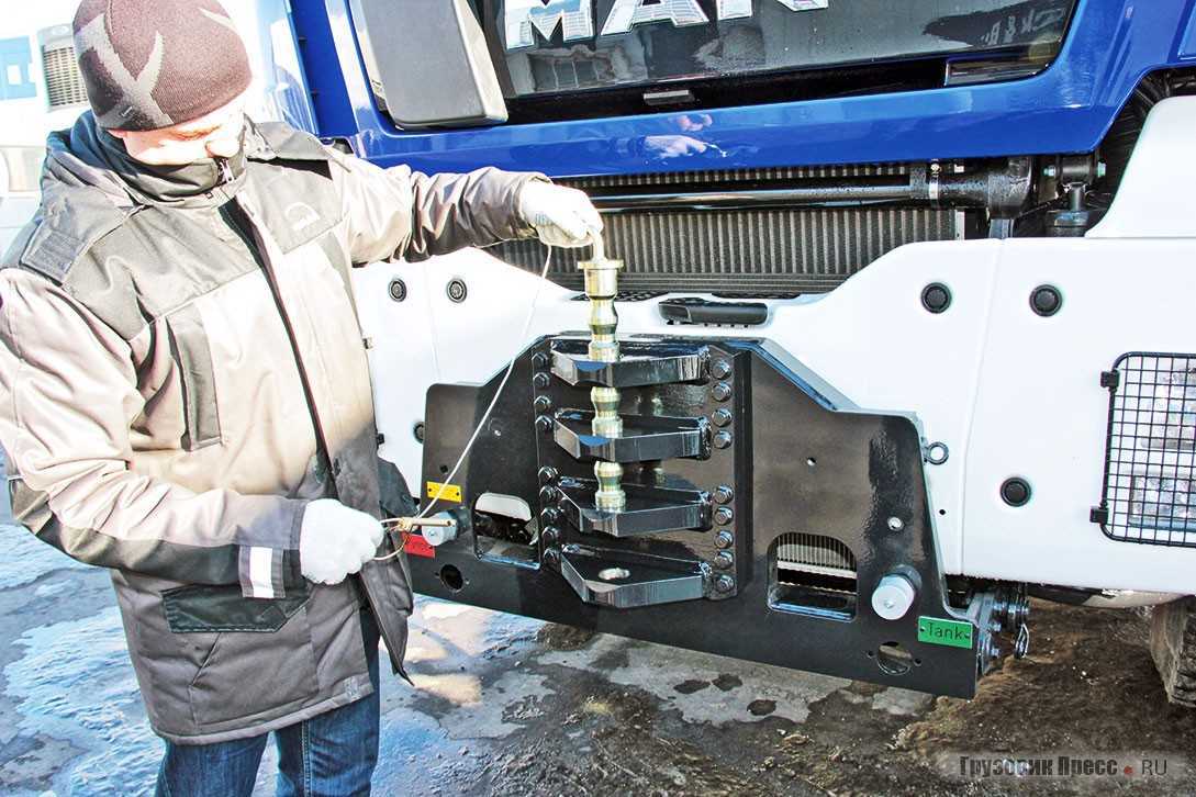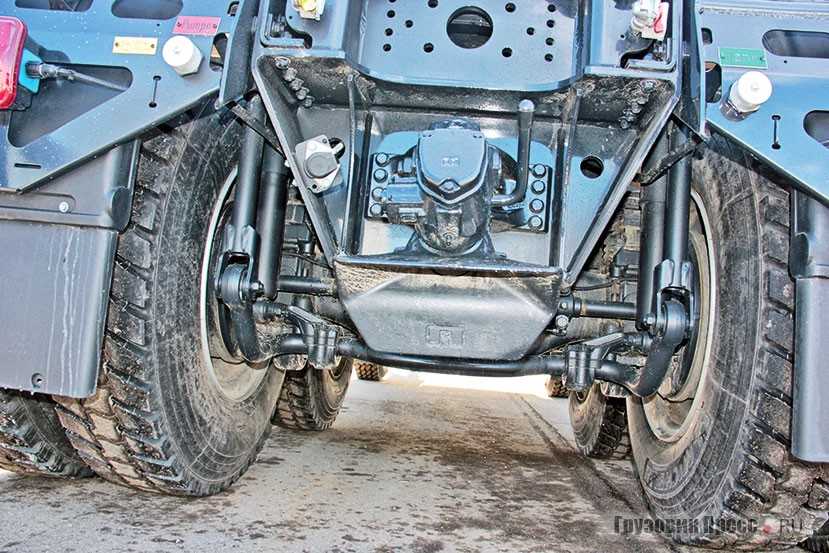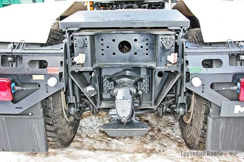 Помимо седельного наш тягач может быть и балластным. Об этом свидетельствуют дополнительное ТСУ ROCKINGER 56 E сзади и регулируемое по высоте фронтальное балластное сцепное устройство (пушпульный блок) спереди, и там и там не забыли про быстросъёмные соединители для гидравлических магистралей. Пушпульный блок даёт дополнительные возможности не только для тяги, но и для торможения, сдерживания тяжёлого автопоезда на уклоне и контроля тяги. В случае подобного сценария эксплуатации необходима установка на седельно-сцепное устройство дополнительного балластного модуля, который представляет собой компактную, но тяжёлую надстройку, имеющую шкворень для зацепления с седлом, ещё при этом на раме устанавливается набор креплений для надёжной фиксации. Седельно-сцепное устройство здесь JOST JSK 38 G-1 3,5’’ с конструктивной высотой 190 мм, плита седельно-сцепного устройства имеет толщину 16 мм, размер предустановки ССУ составляет 1075 мм от центра последней оси.