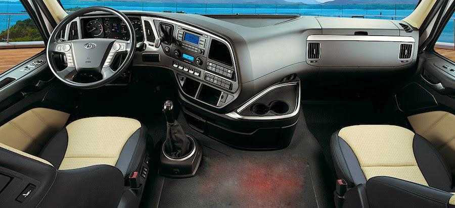 Все элементы выполнены из качественного пластика темных тонов. В интерьере отсутствуют детали, имитирующие натуральное дерево, характерные для предыдущих моделей тяжелых автомобилей Hyundai.