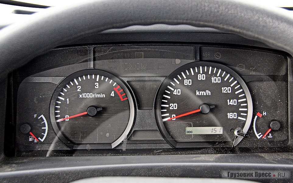 Панель приборов незамысловата и выполнена в виде единого блока. Вниманию водителя представлены только спидометр, тахометр, датчики температуры и уровня топлива. Работу остального оборудования контролирует электроника, и в случае каких-либо неисправностей на панели загорится соответствующая пиктограмма. Из различий отметим, что в малотоннажнике базовая комплектация включала электрические стеклоподъемники. На более тяжелом Isuzu NMR 85 такое оборудование доступно лишь в виде опции. Зато все машины в заводской комплектации оснащены подогревом зеркал заднего вида.