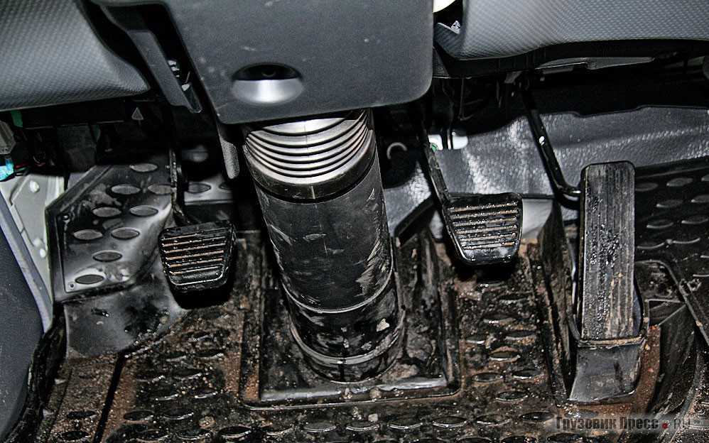Фильтр-сепаратор для предварительной очистки топлива размещен сразу за передним правым колесом. Поэтому для его защиты от грязи и камней предусмотрен специальный металлический щиток.